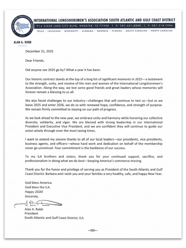 To my ILA brothers and sisters, thank you for your continued support, sacrifice, and professionalism in doing what we do best—keeping America’s commerce moving.