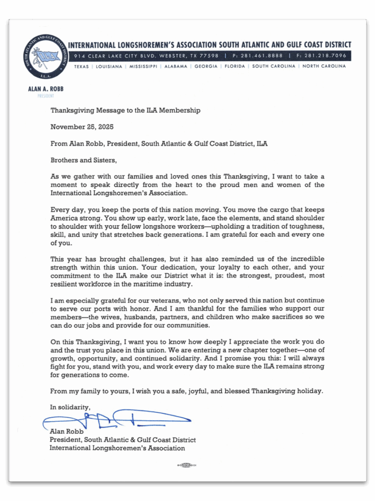 On this Thanksgiving, I want you to know how deeply I appreciate the work you do and the trust you place in this union. We are entering a new chapter together—one of growth, opportunity, and continued solidarity. And I promise you this: I will always fight for you, stand with you, and work every day to make sure the ILA remains strong for generations to come.